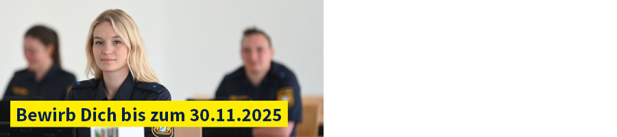 Die Bayerische Polizei stellt jährlich zum 01.03. und 01.09. Nachwuchsbeamte ein. Die Bewerbungsfrist für einen Ausbildungsstart im September 2026 beginnt am 01.05.2025 und endet am 30.11.2025. Wir haben hohen Nachwuchsbedarf.